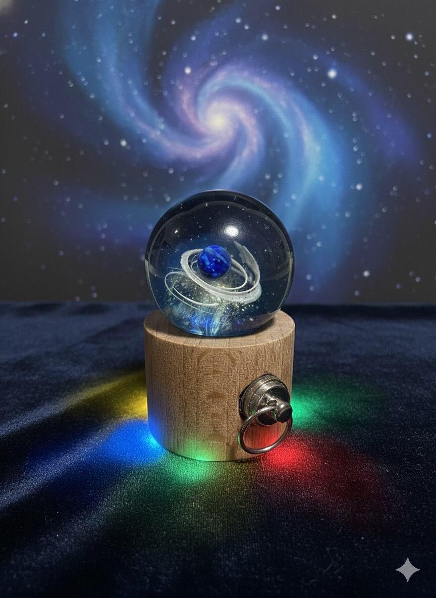 台座のリングを優しく回すだけで、宇宙玉の底から青、緑、黄、赤の4色の光が幻想的に溢れ出します。まるで宇宙の星々が瞬くかのように、光の色が変化し、見る角度や光のたり方によって、宇宙玉の中の惑星や星雲が異なる表情を見せてくれます。