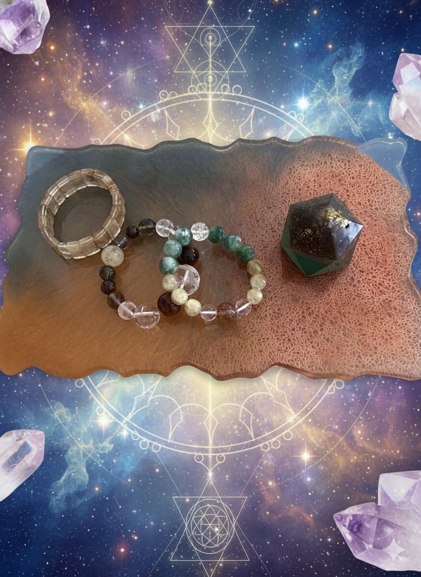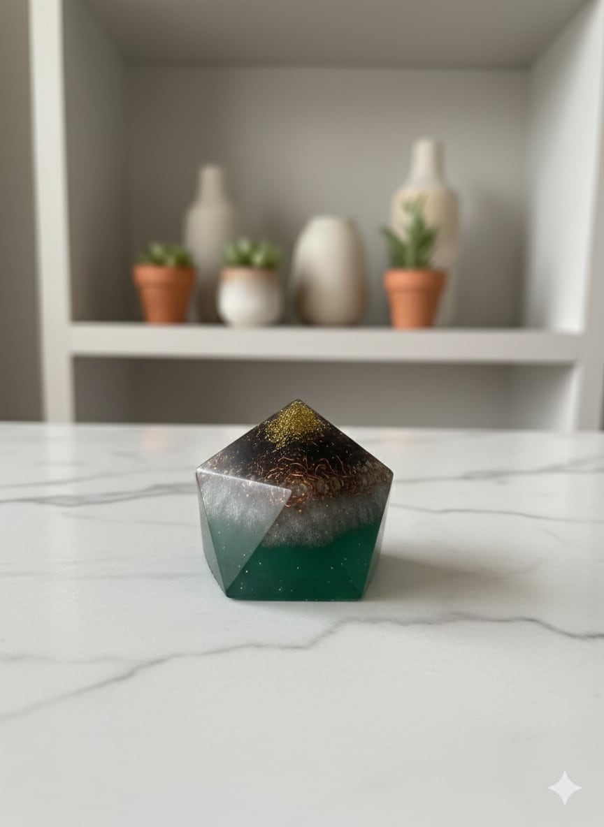 このオルゴナイトは、強力な開運パワーと良いスタートを切るためのエネルギーを宿しています。大木を意味する緑と輝く金のカラー開運要素が、あなたの運気を高めます。