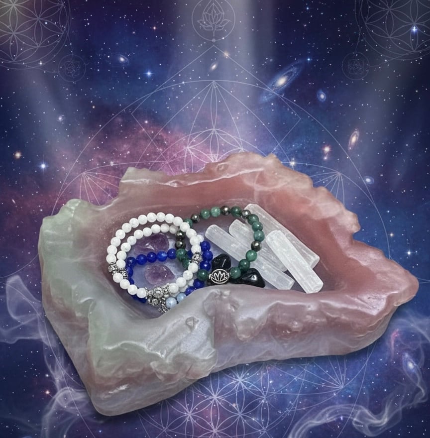 この浄化トレイは、ひとつひとつ私の手でエネルギーを整えながら生み出した一点ものです。石の表情や重なり、波動の流れを感じ取り、その瞬間に最も調和する形へと導いています。アクセサリーやパワーストーンを置くことで、溜まった不要なエネルギーを清め、自然なエネルギー循環を促進。持ち主と共鳴しながら、空間と心をやさしく整えるための器です。同じものは二度と生まれないからこそ、出会いそのものがご縁。清め・整える習慣を通して、日常に静かな開運の流れをもたらします。大きさは約15センチ